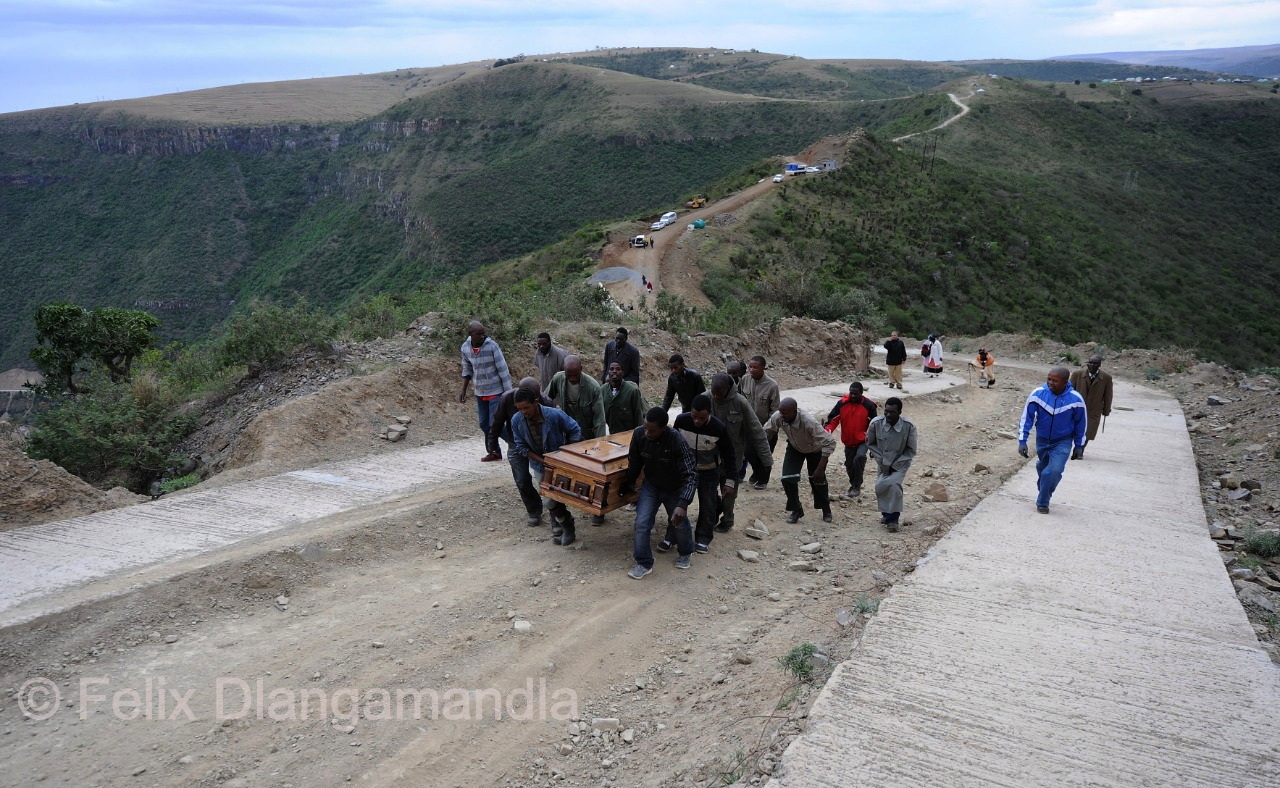 The impact was felt, from Lesotho to far flung villages of North West, Eastern Cape, by the families of the people who died in Marikana. Some of these guys were breadwinners. If you look at that photograph, people are carrying that coffin up that hill, we call it a hill, it’s [actually] a mountain because cars couldn’t travel up there to this guy’s house. It shows the level, the level, not necessarily poverty, but that this guy went to Marikana to try and better his living [standard]. He had kids, he had a wife at home that he left behind. When he has to be buried he doesn’t get a proper dignified burial because of the roads that are poor. People had to put down his coffin, take turns [to carry it] because his body is heavy, walk up three kilometres to his house. For one thing that they were fighting for, which is a better living wage. They were not fighting actually, but they gathered down to say look, we need a better living wage. Please assist us and those cries fell into deaf ears. – Mukurukuru Media
