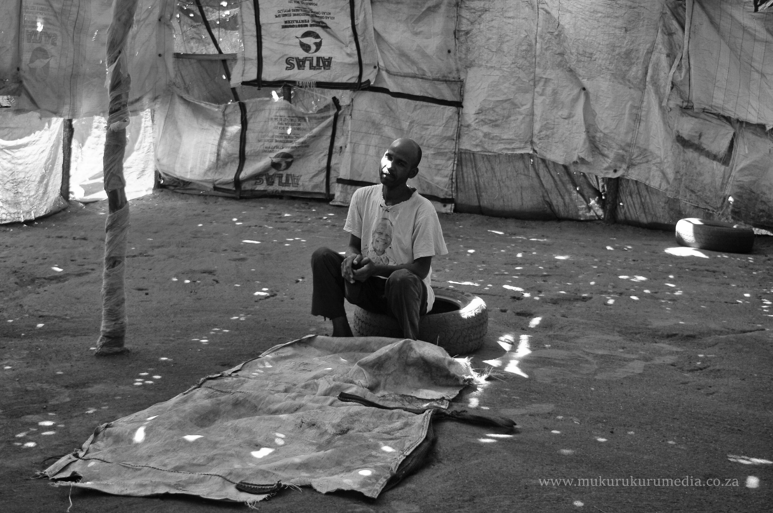 Johannes Mpsa sits in one of the makeshift structures where workers slept. The farmer deducted R200 monthly for accomodation from the workers. Photo: Lucas Ledwaba/Mukurukuru Media