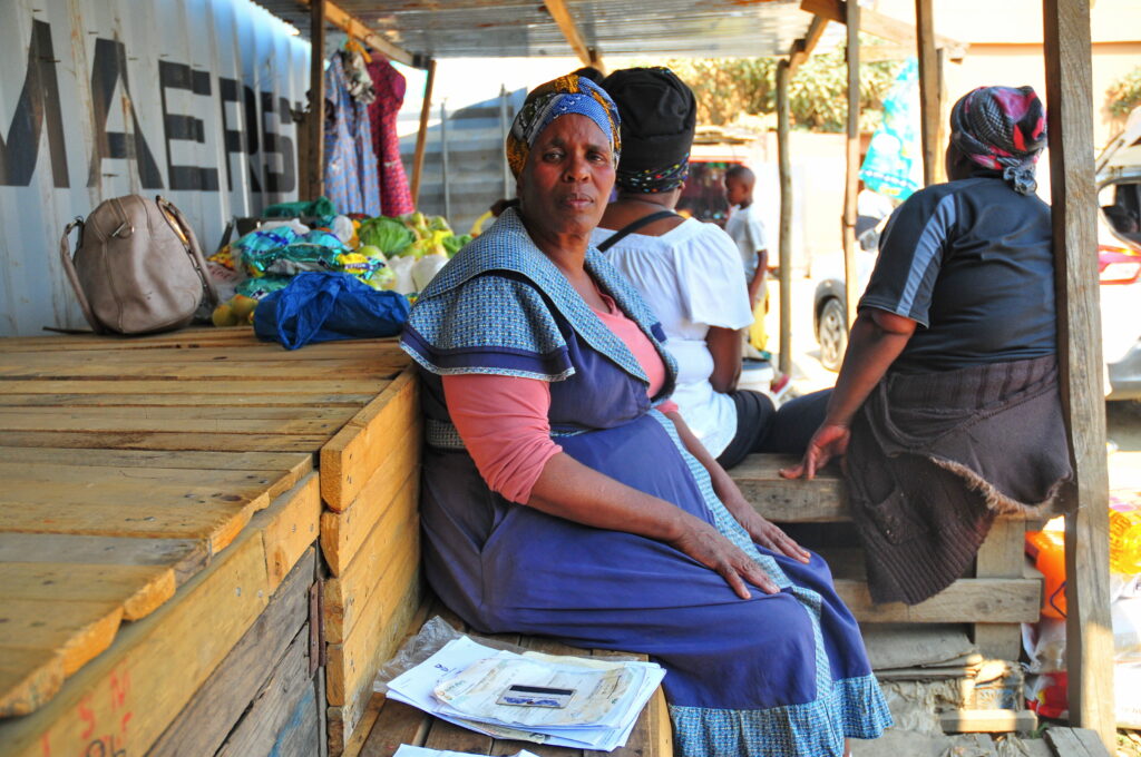 Nokukhanya Mguca at her stall in Lusikisiki. She is waiting for her claim for financial compensation to be processed by the Tshiamiso Trust. Mguca has resorted to selling vegetbales and fruit in Lusikisiki town in the Eastern Cape to support herself and her family. Her children have had to drop out of school and seek alternative means of survival. Photo: Lucas Ledwaba
