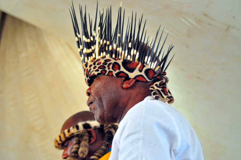 A member of a delegation from the Bapedi Mampuru traditional council from Limpopo showed up in a stunning porcupine quill headgear. Photo: Lucas LedwabaA guest shows appreciation to the spirited performance by Ntombethongo. Photo: Lucas LedwabaA Bapedi praise poet renders an item to the delight of guests. Photo: Lucas LedwabaWho said ladies and gents can’t have fun together in traditional song and dance? Photo: Lucas Ledwaba