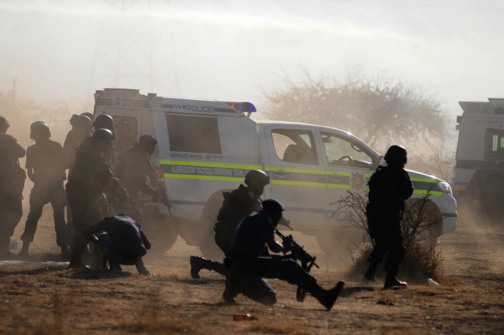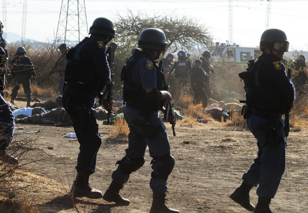 13 August – Between 100 and 200 men leave the koppie where they had gathered two days earlier and march to K3 Shaft to stop operations. On their way back they are met by police who instruct them to lay down their weapons. They refuse and proceed towards the koppie. Police fire teargas and stun grenade on the group.