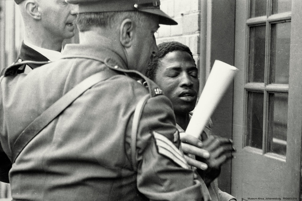 Photojournalist Peter Magubane being arrested by police while covering violence in Alexandra township during the Struggle against Apartheid.