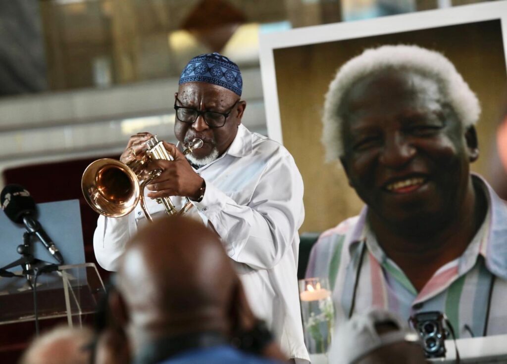 Musician Prince Lengoasa blows a tune in honour of the fallen lensman. Photo: Gauteng Provincial Government