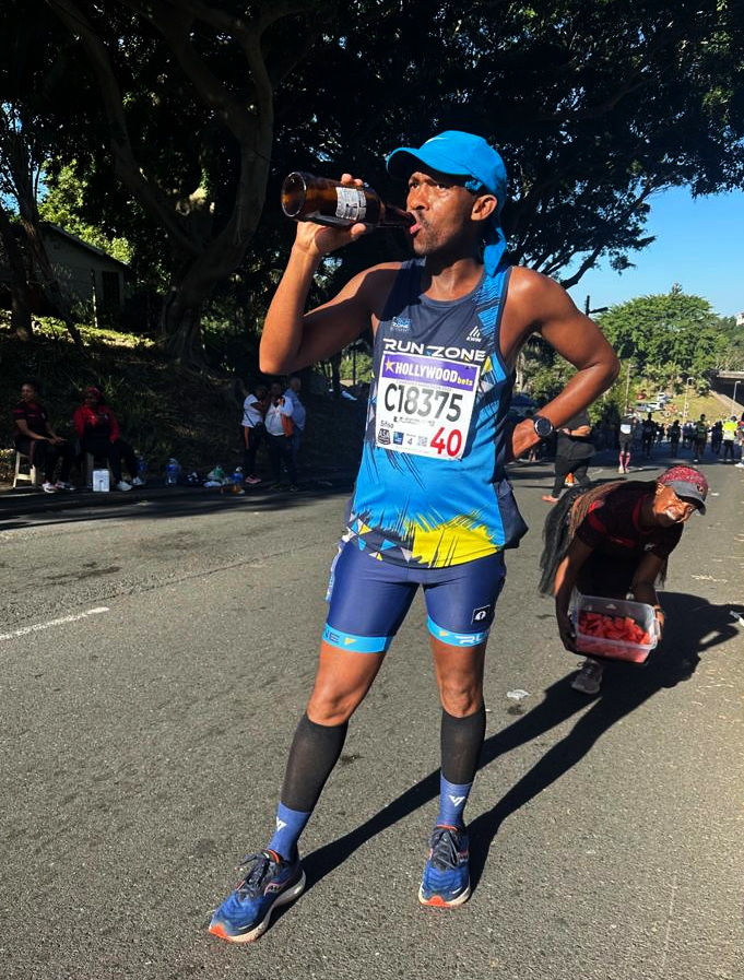 Sifiso getting his carbohydrates, which runners also call carbo loading, at the 80km mark
